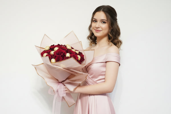 Lovely design featuring fresh fragrant 16 red Roses and 16 Ferrero Rocher Fine Hazelnut Chocolates. Enjoy this gorgeous custom design bouquet or fill someone heart with love and happiness.